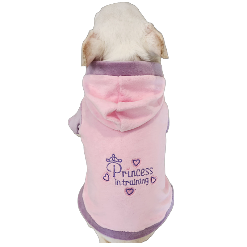 This casual oversized hoodie is made with soft pink and lilac velour fabric. It is embroidered with the words ” Princess in Training” as well as a crown the back. The jacket has a zipper front closure for design. This hoodie runs oversized. It is recommended to size down.